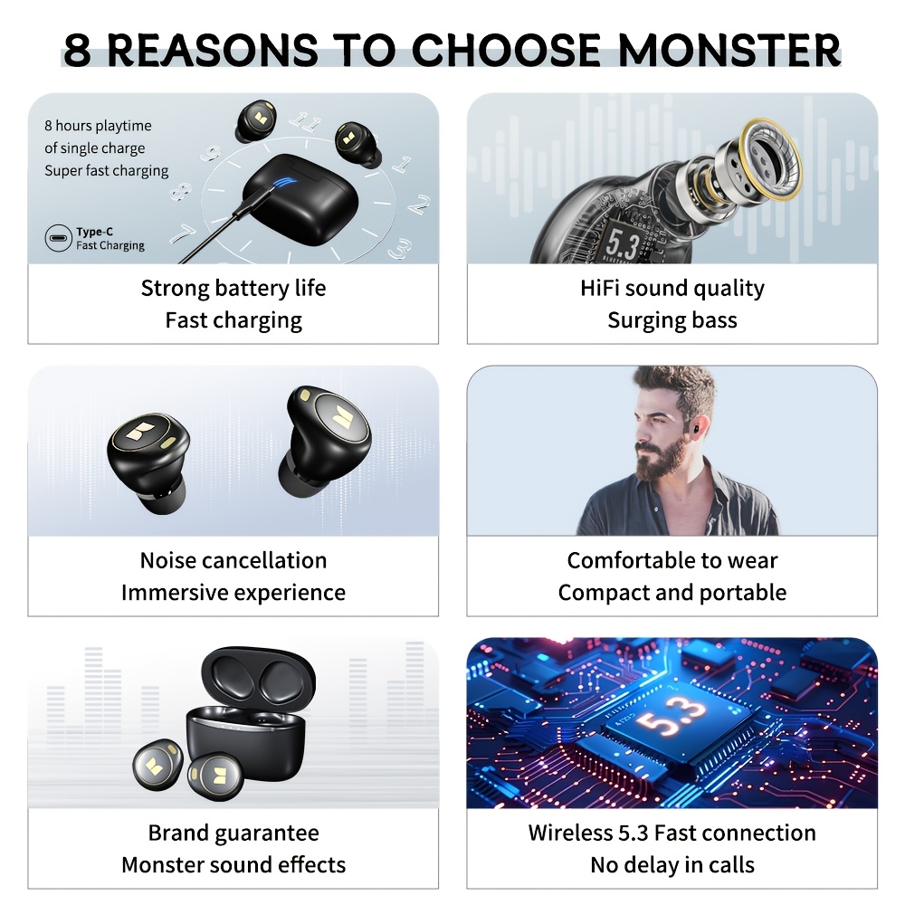 Auriculares inalámbricos Monster, intraaurales inalámbricos de 5.3" con 4 micrófonos, llamadas nítidas, cancelación de ruido, control táctil y estuche de carga tipo C. Cómodos auriculares inalámbricos para uso diario