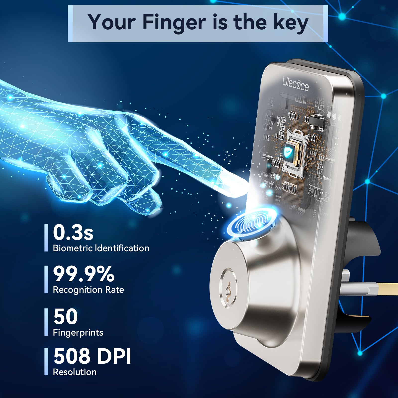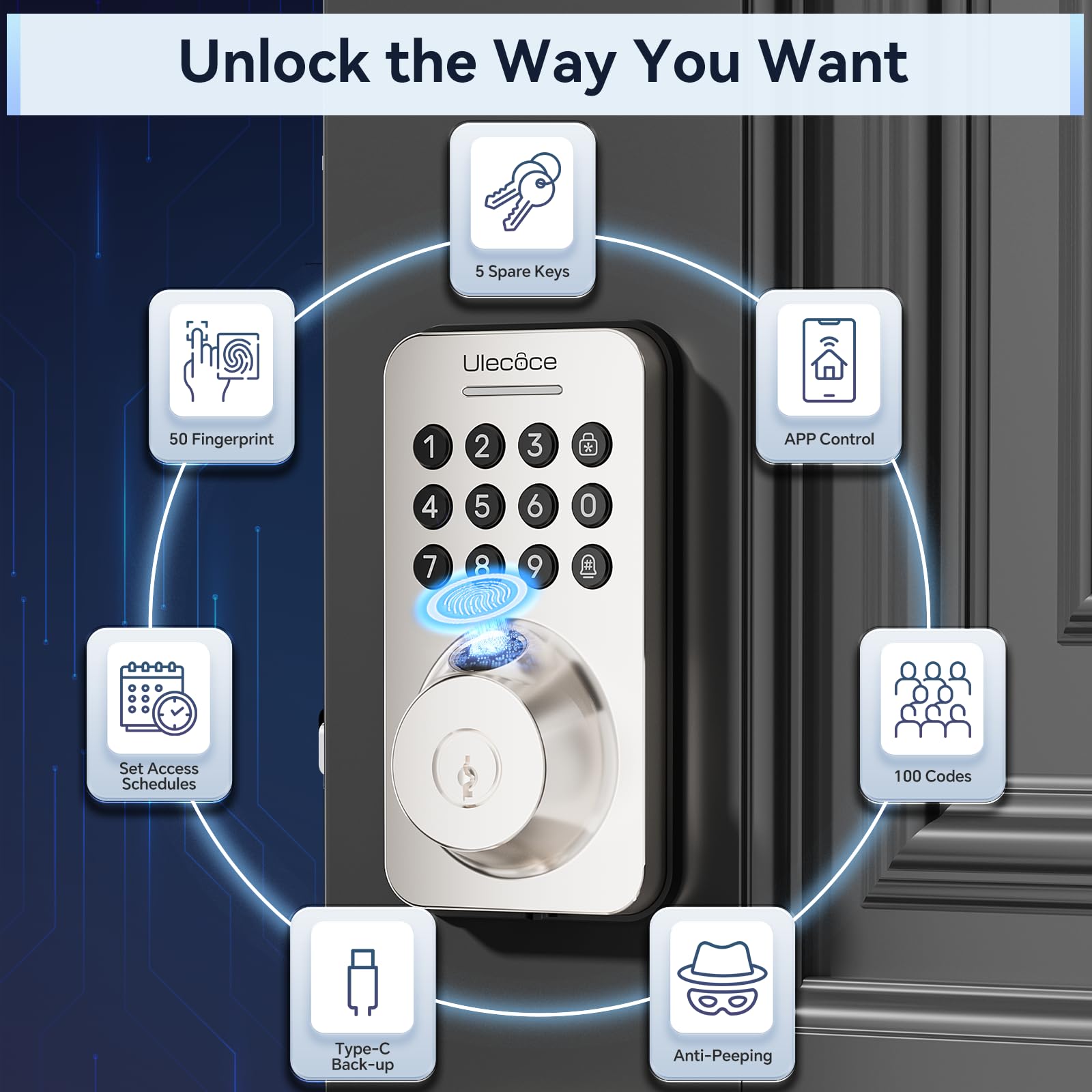 Desbloqueo 5 en 1: Admite 50 grupos de huellas dactilares, 50 grupos de códigos de acceso mediante teclado, desbloqueo por app con un alcance de hasta 50 metros, desbloqueo con un solo toque y también se puede usar la llave. Las cerraduras de puerta con huella dactilar pueden generar y compartir códigos de un solo uso, permanentes, temporizados, recurrentes, personalizados y de borrado con diferentes visitantes y amigos.
