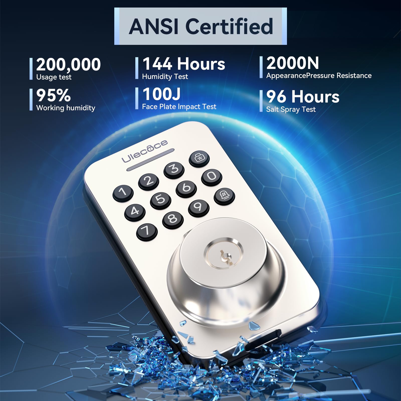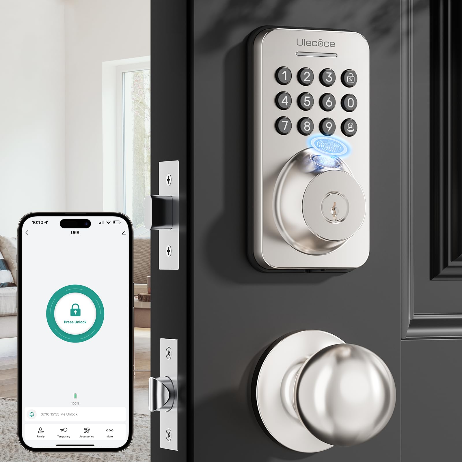 Cerradura de seguridad Ulecoce con teclado y manija, entrada sin llave, control por aplicación, cierre automático, fácil instalación, níquel satinado